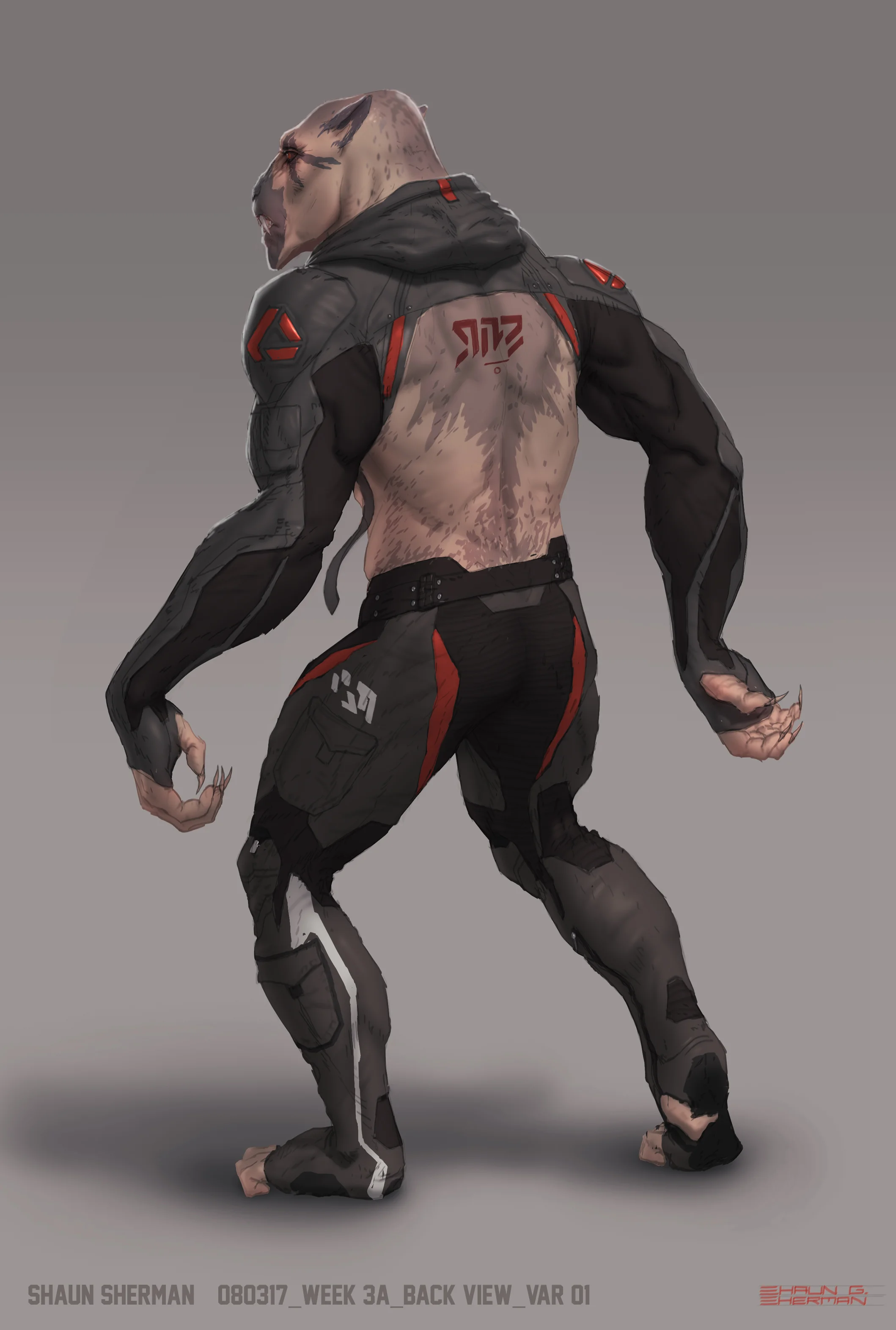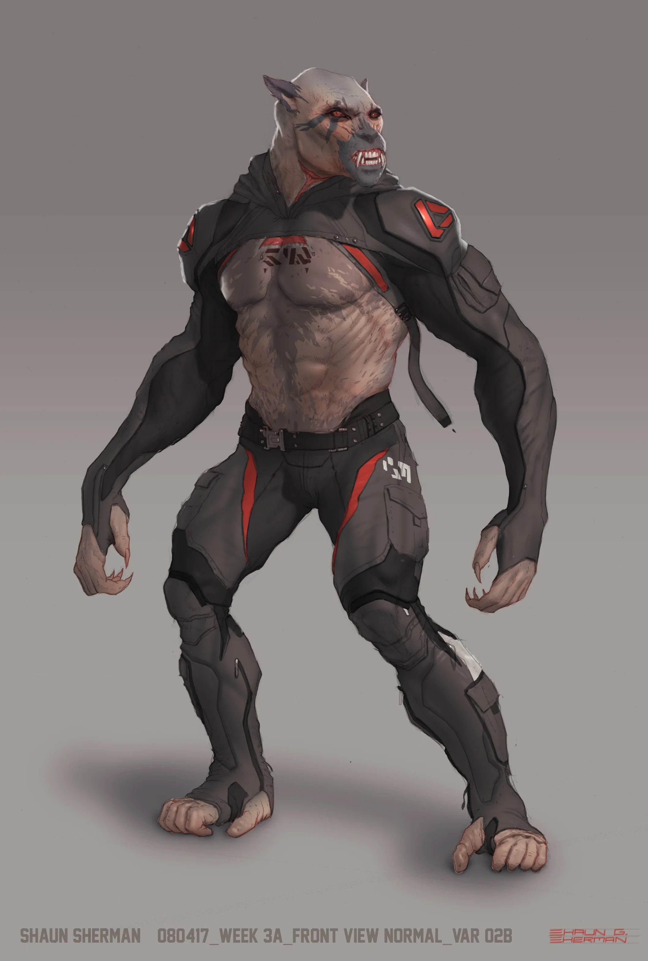 Creature Design in a front view 3/4 pose with weapon. Modelled and textured in Zbrush.
